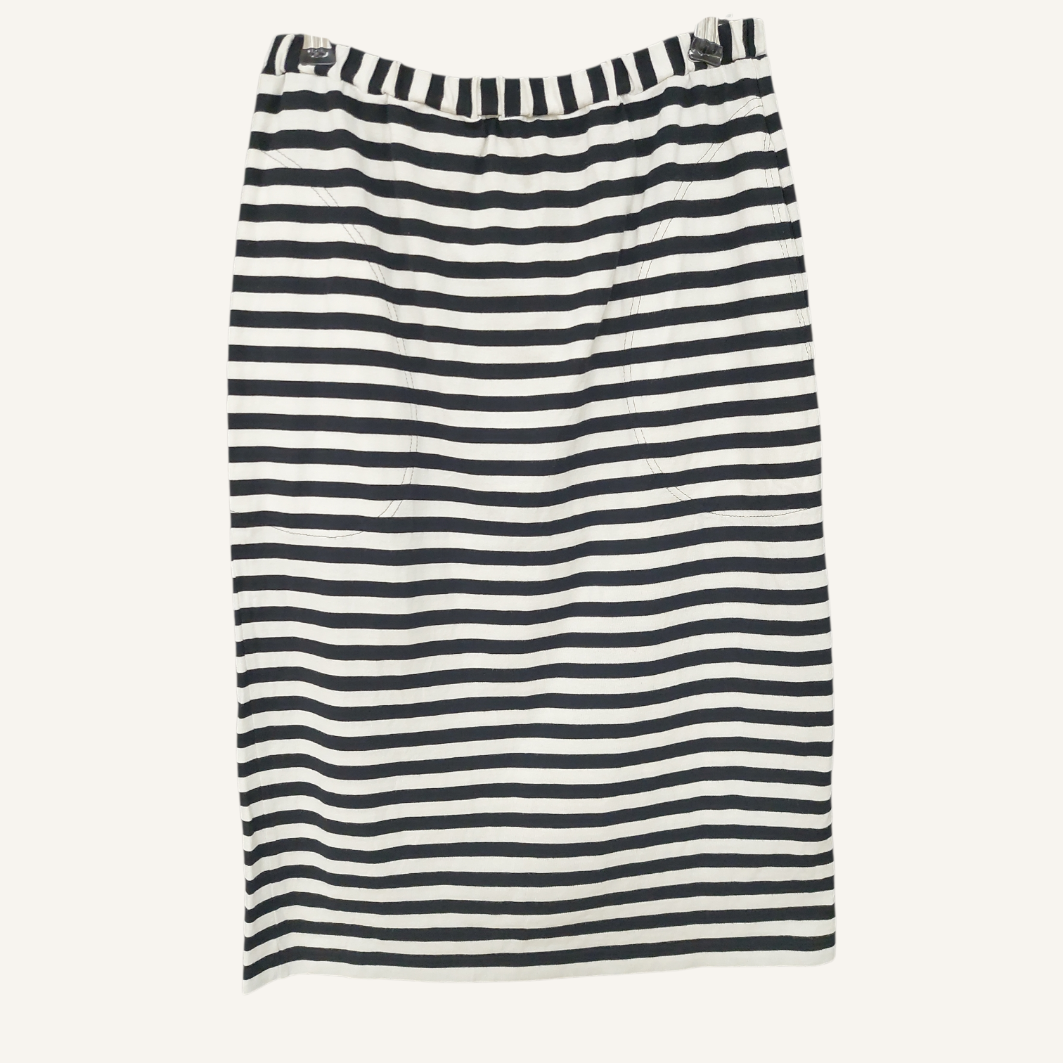 Marimekon raitahame väri: mustavalkoraitainen, edessä isot taskut koko: M materiaali: 100% puuvilla