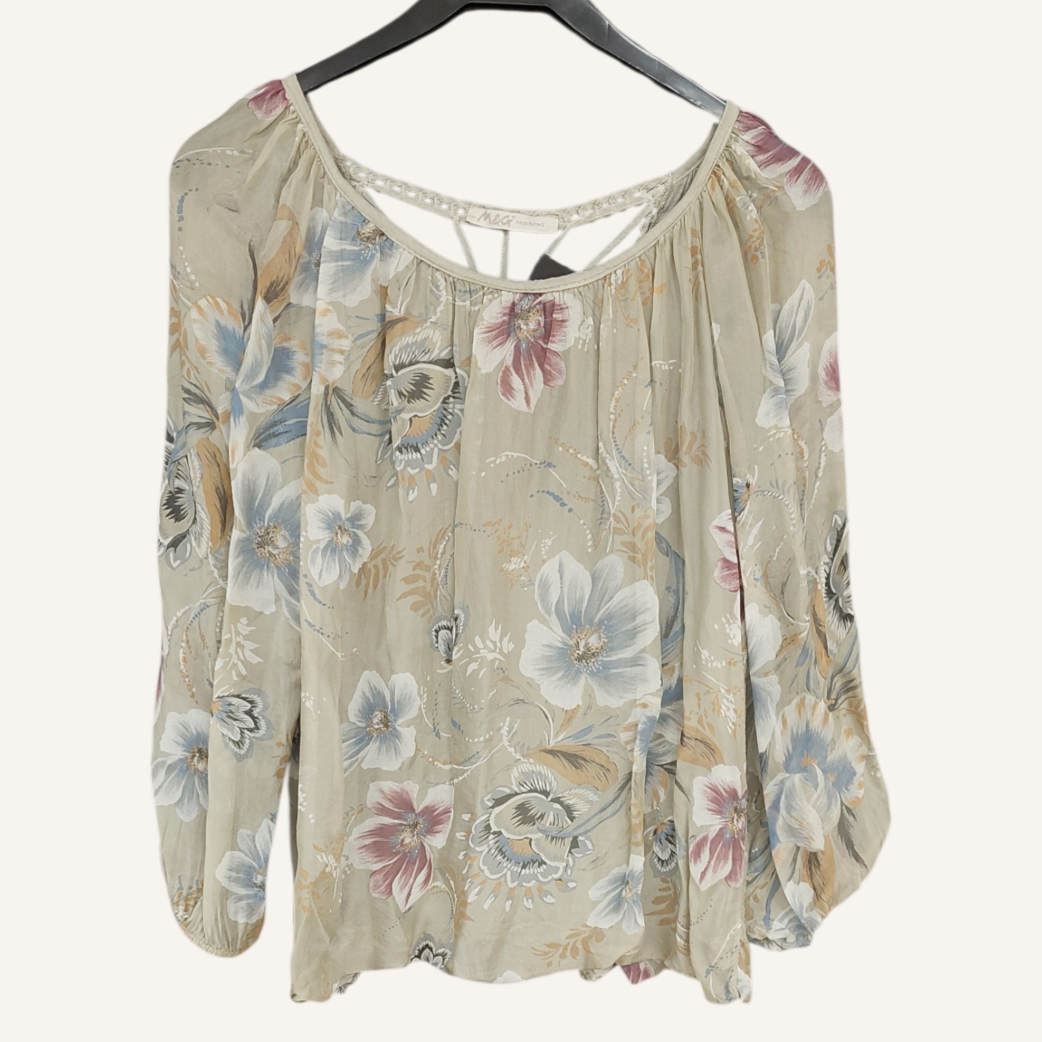 Kaunis ohut paita merkiltä M&G made in Italy Selässä kaunis yksityiskohta. koko: S väri: vaalean vihreä/ sini/lila/oranssi materiaali: 30%silkki, 70% viskoosi sisäkangas: 95% viskoosi, 5% elastaani käsinpesu