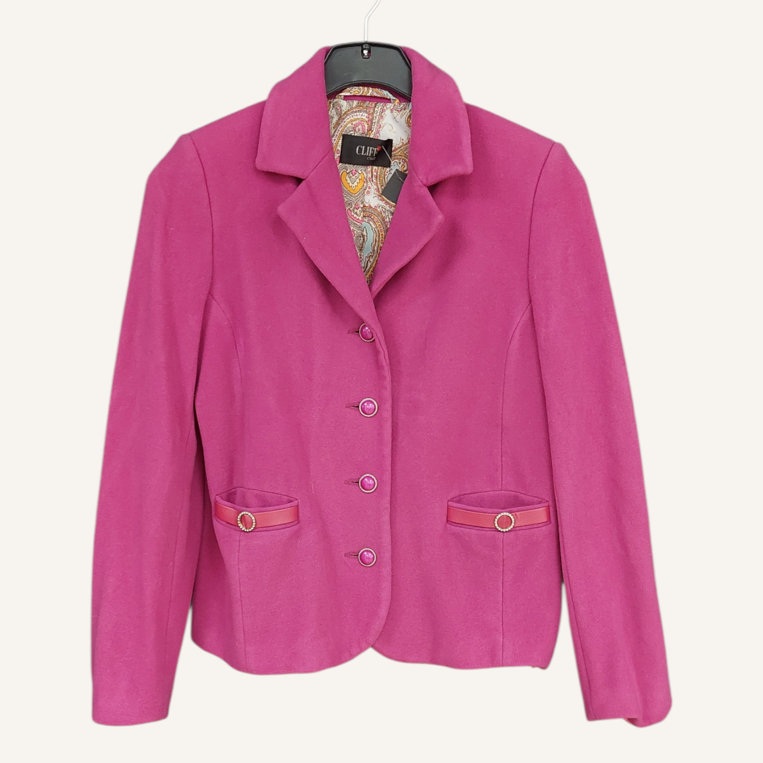 Cliff coat jakkutakki, pinkki kevyet olkatoppaukset, kaunis kuvioitu vuorikangas. koko: 38 materiaali: 65% villa 20% cashmere 15% polyamidi