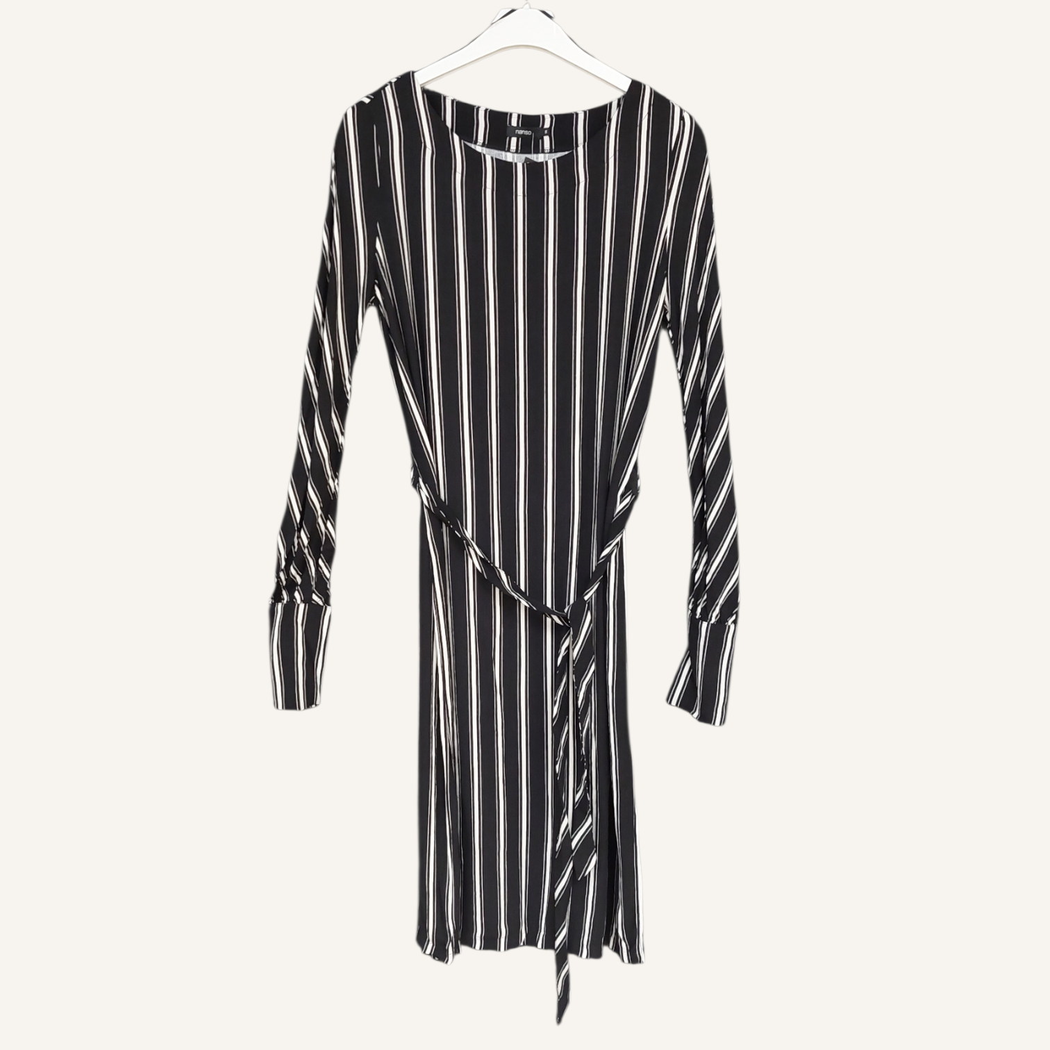 Joustava, mukavasti laskeutuva tunika merkiltä nanso. Malli nimeltään linja. Sisäpuolelta ihanan pehmeä/sileä! koko: 36 väri: mustavalko raitainen materiaali: 100% viskoosi