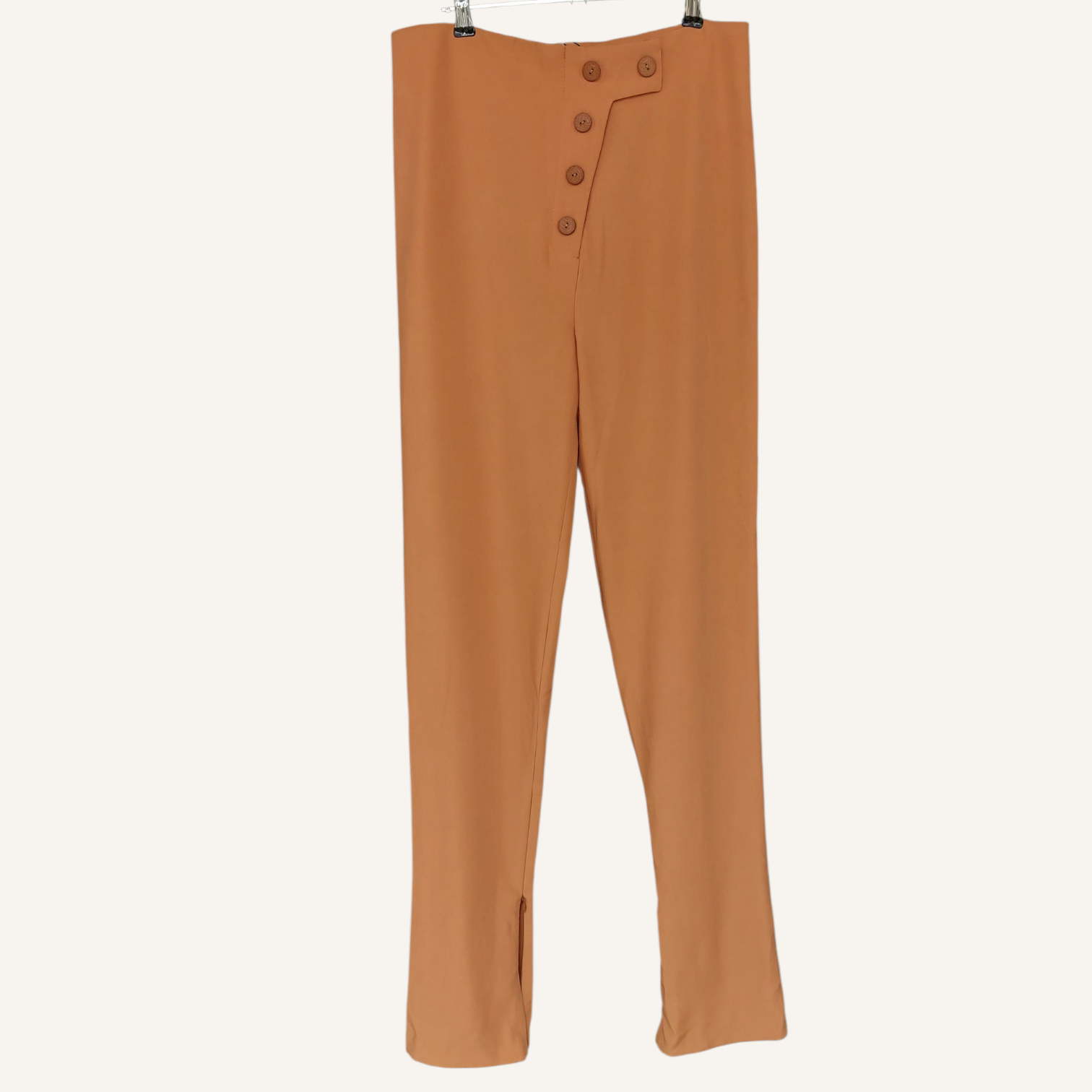 Salmone high-waist leggings. Tyylikkäät ohuet housut koristeellisilla napeilla. Lahkeissa pitkä halkio piilovetoketjulla. koko: L (pitkä ja kapea malli) haarasta lahkeeseen 90cm. Material: 95%Polyester, 5%Spandex