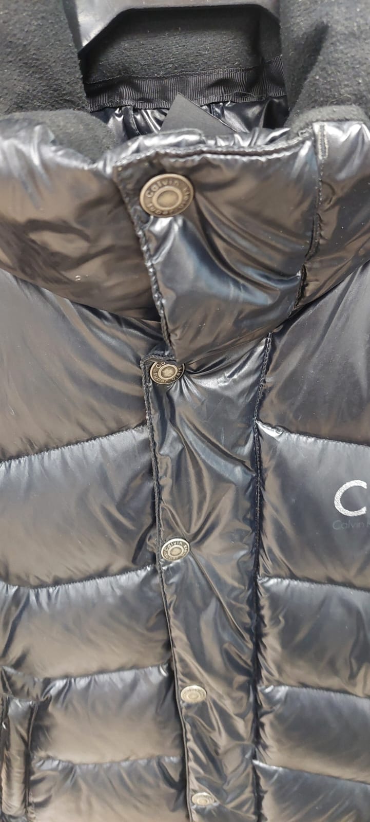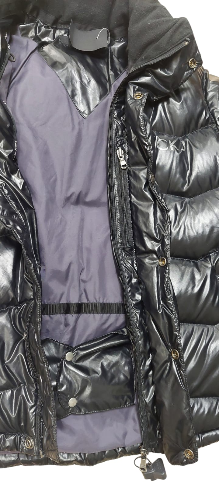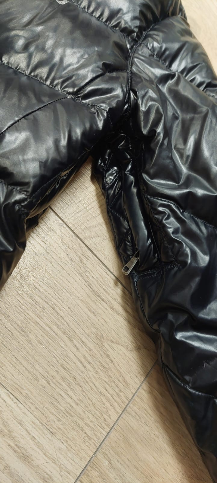 Materiaali keinonahkamaista, väri musta. Taskut sivuilla, käsivarsissa ja takin sisäpuolella yksi povitasku.