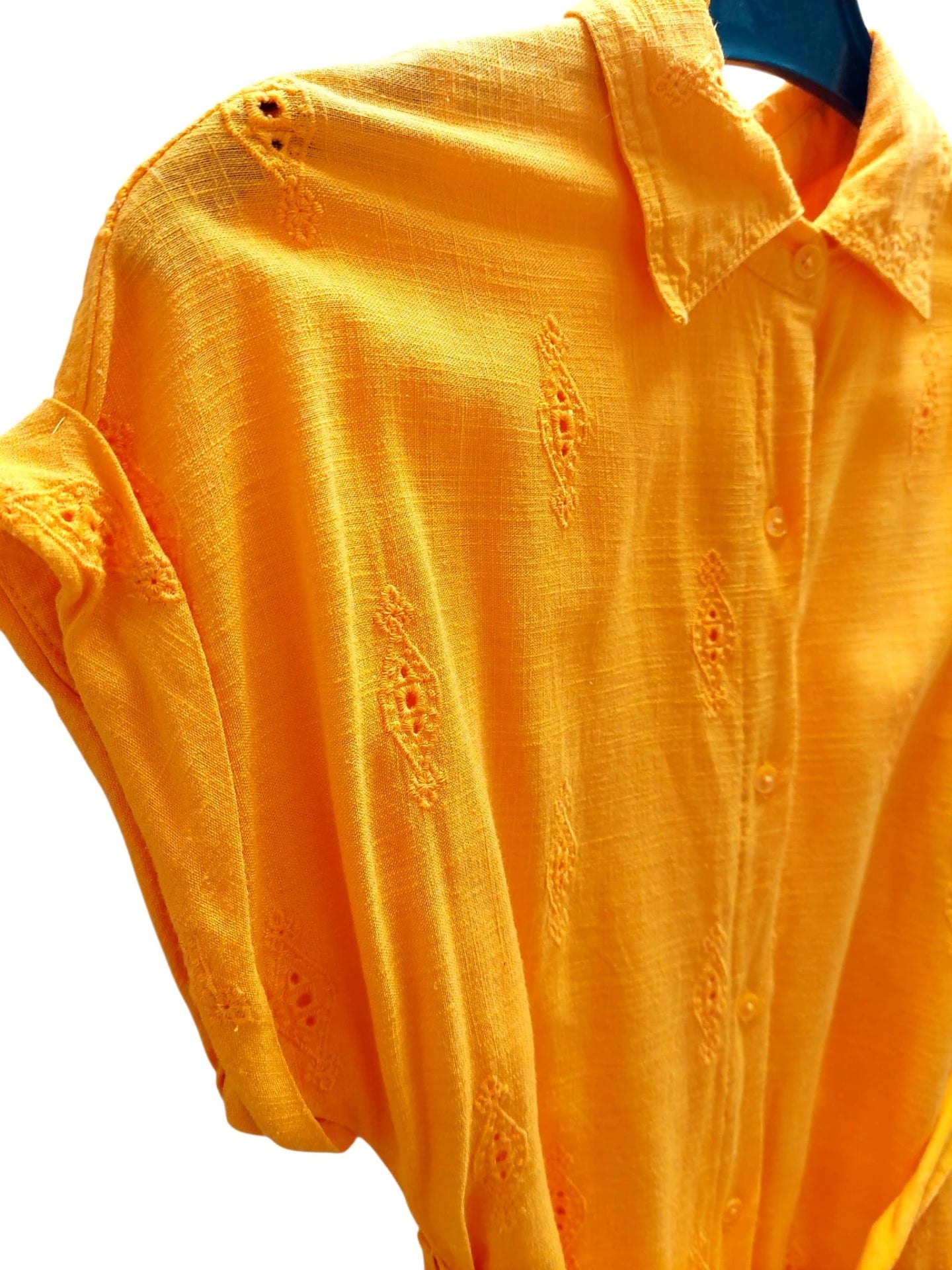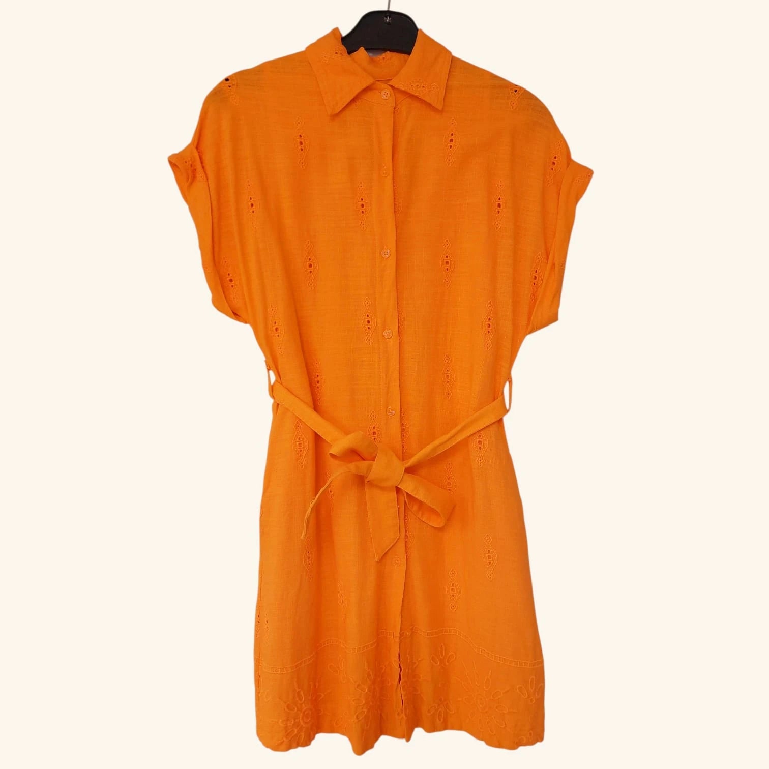 Kirkkaan oranssi mekko espanjalaiselta Desigual-merkiltä. Tämä räikeän värinen mekko on täynnä kauniita yksityiskohtia ja se on valmistettu osittain pellavasta.